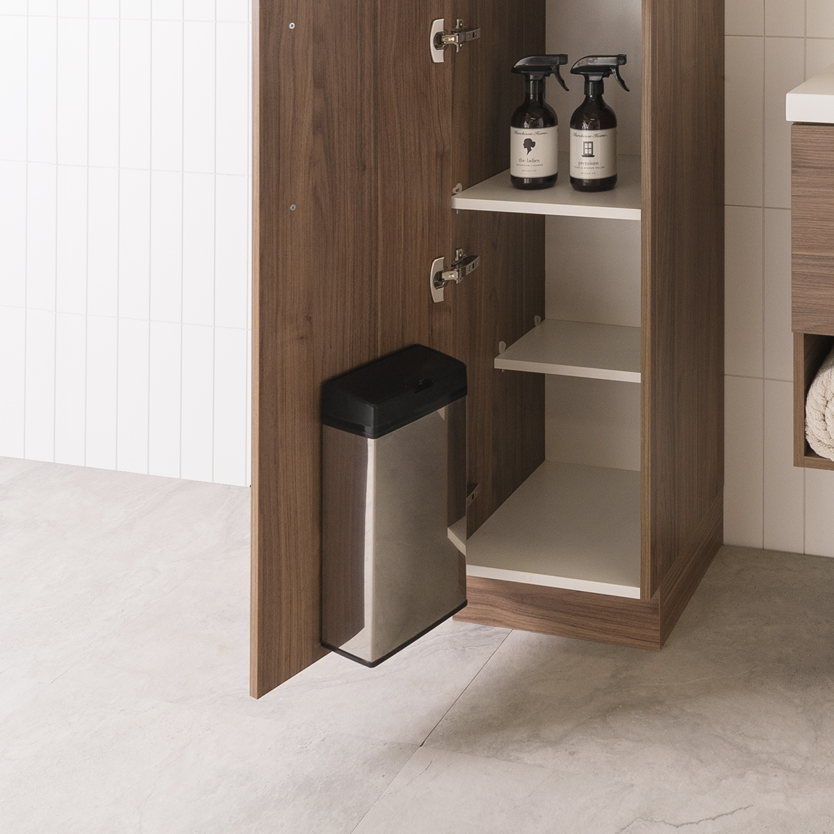 6L stainless steel bin, with push-to-open lid. Mounted on inside of bottom door.