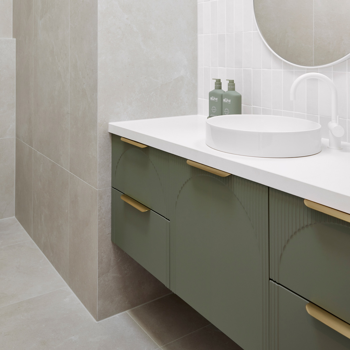Complimentary 180mm splashback with 80mm radius, in matching benchtop colour.