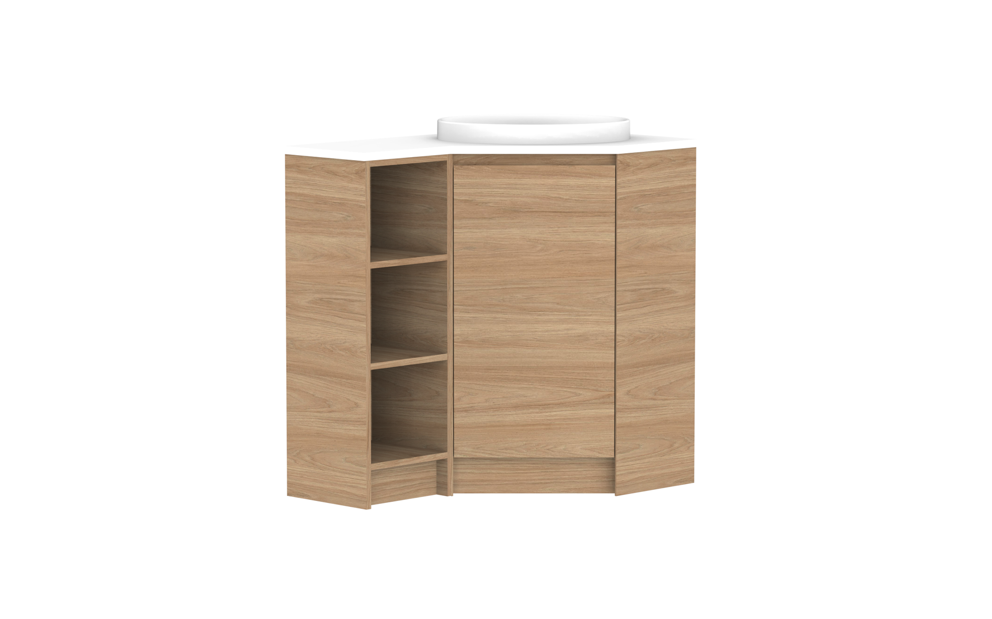 Glacier Corner 600x900 Open Shelf FM, Benchtop Offset