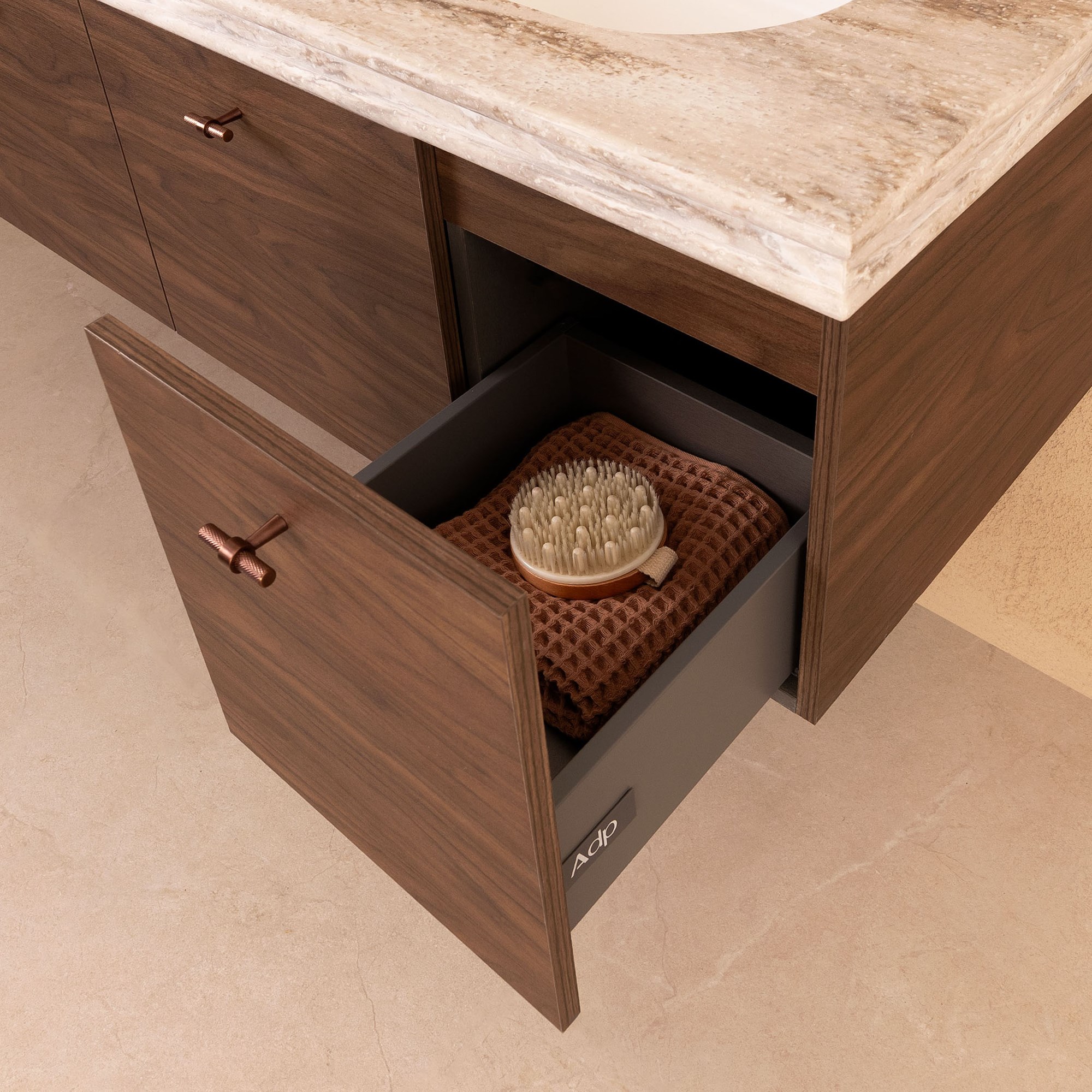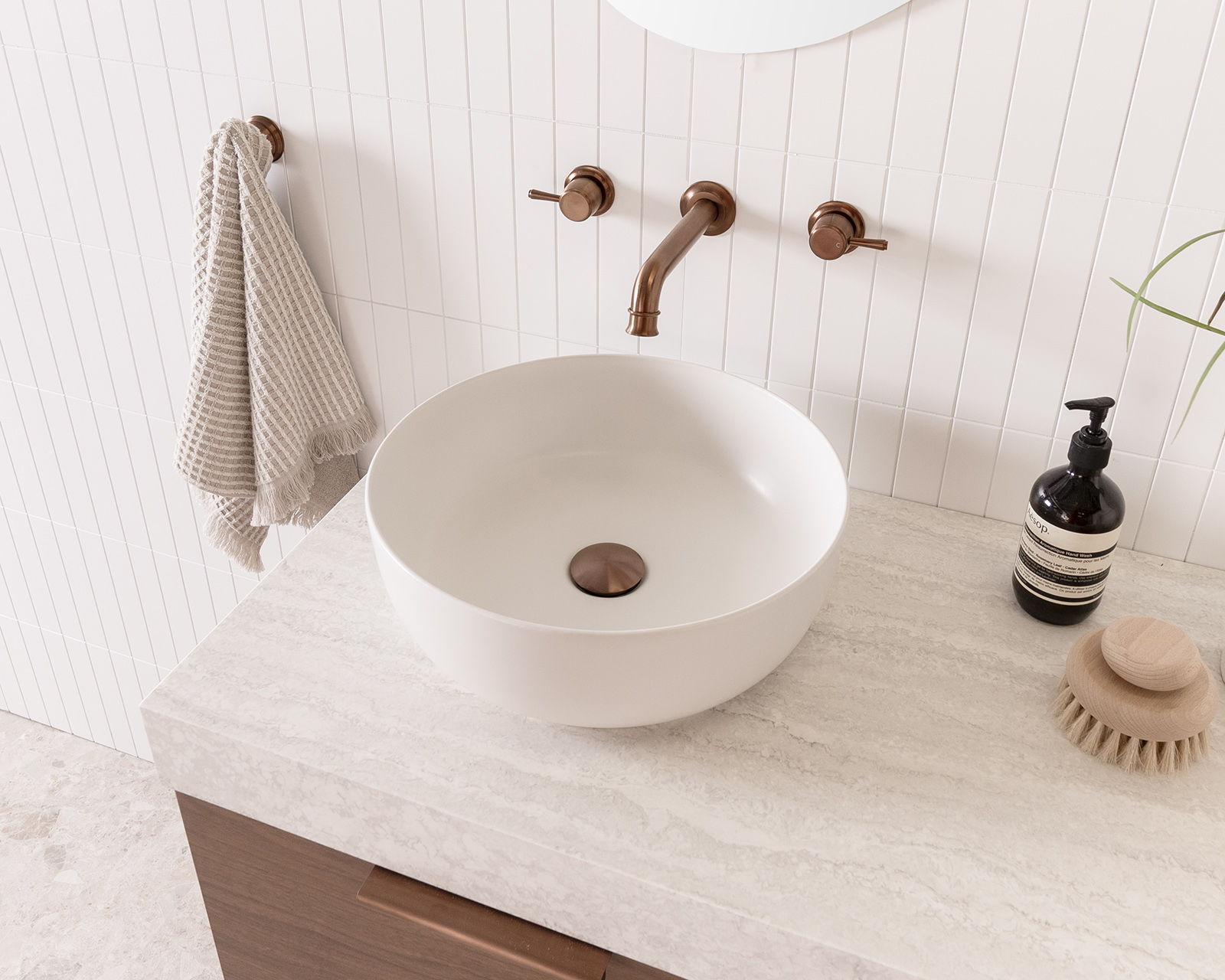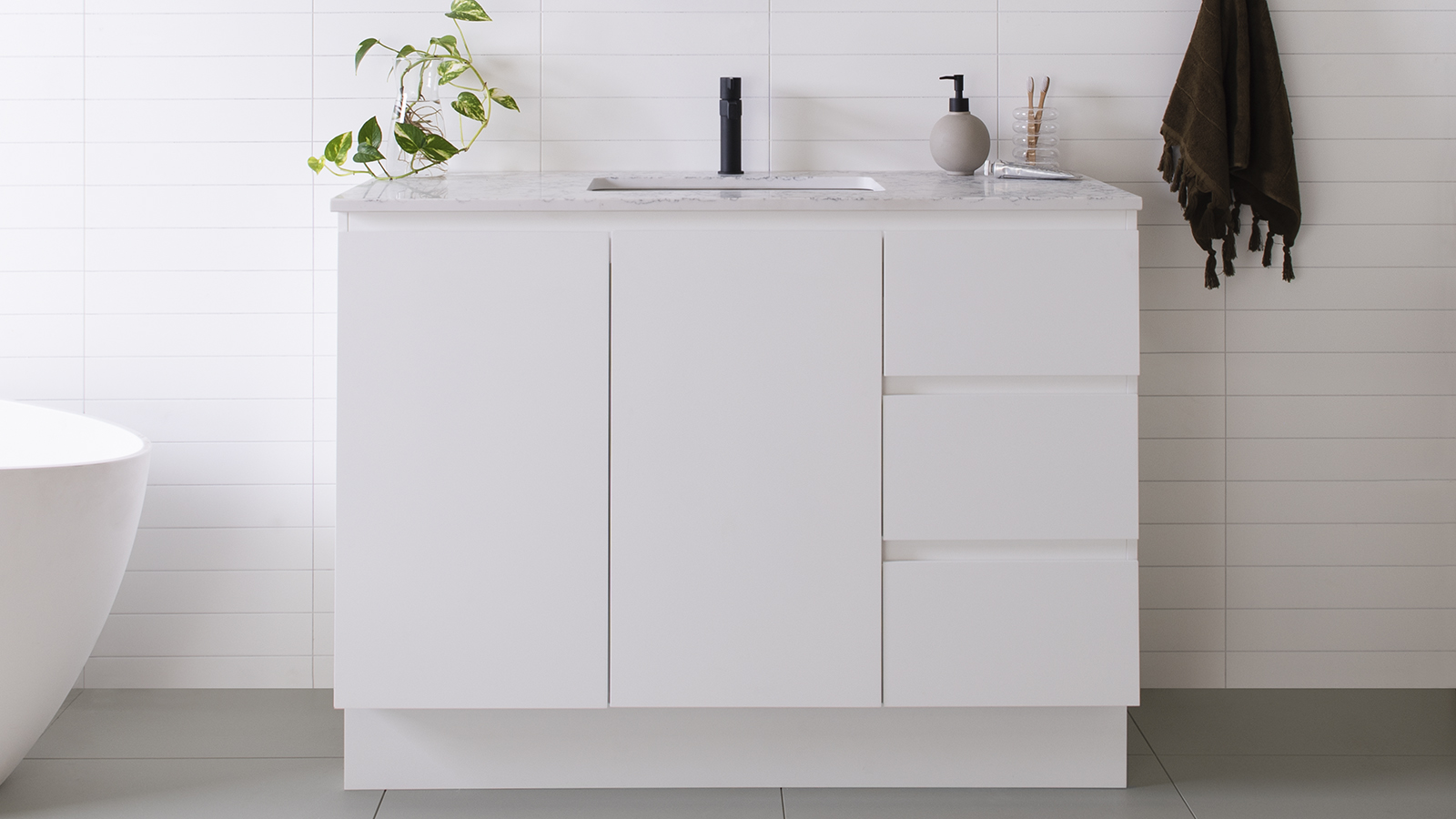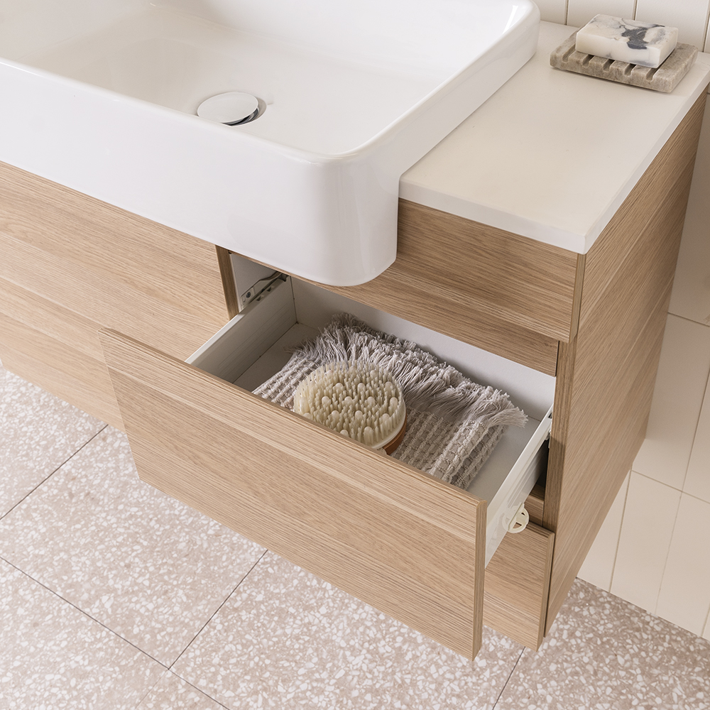 Choose from Ceramic or Cast Marble moulded tops (0, 1 or 3 tap hole available) or benchtop options*.