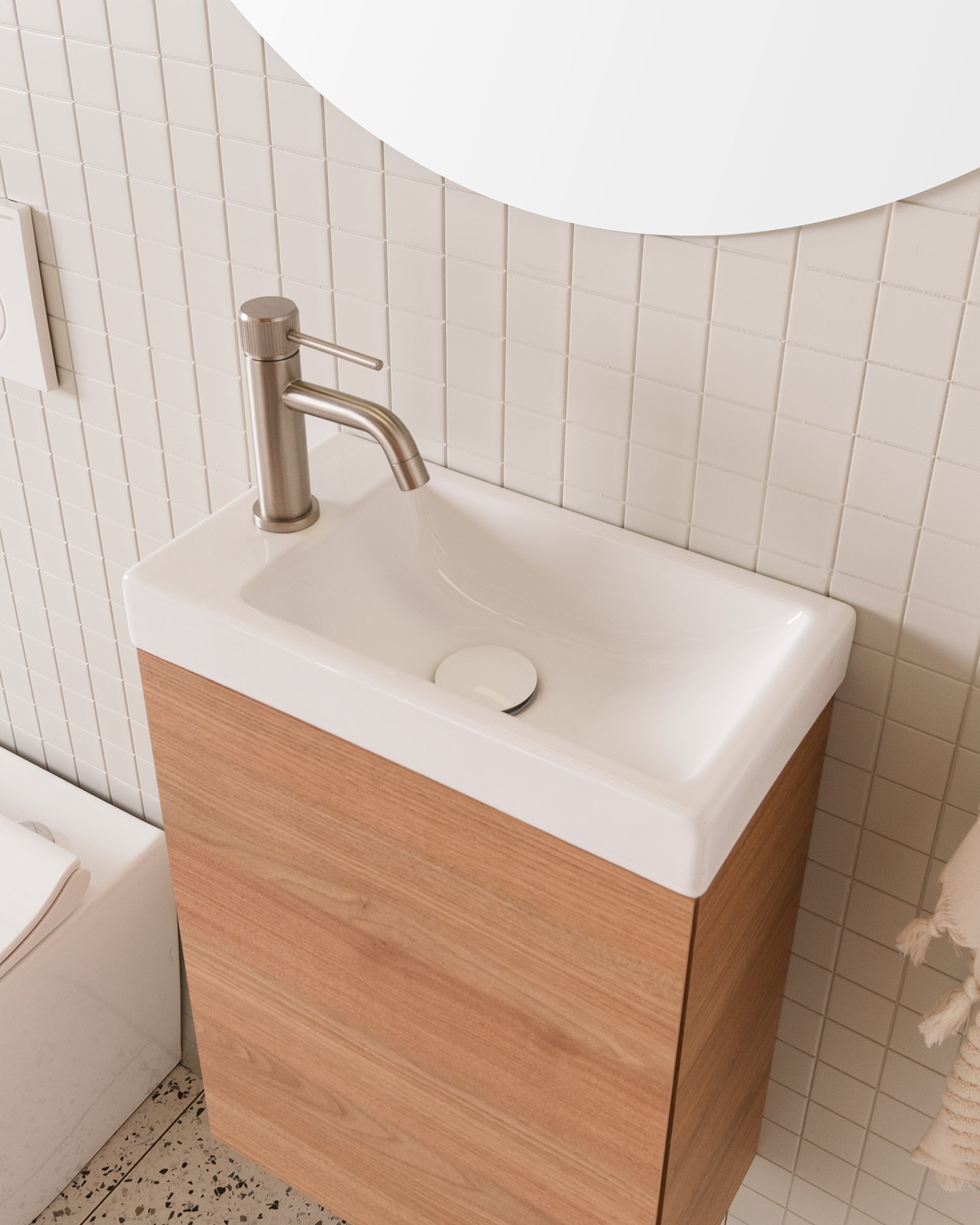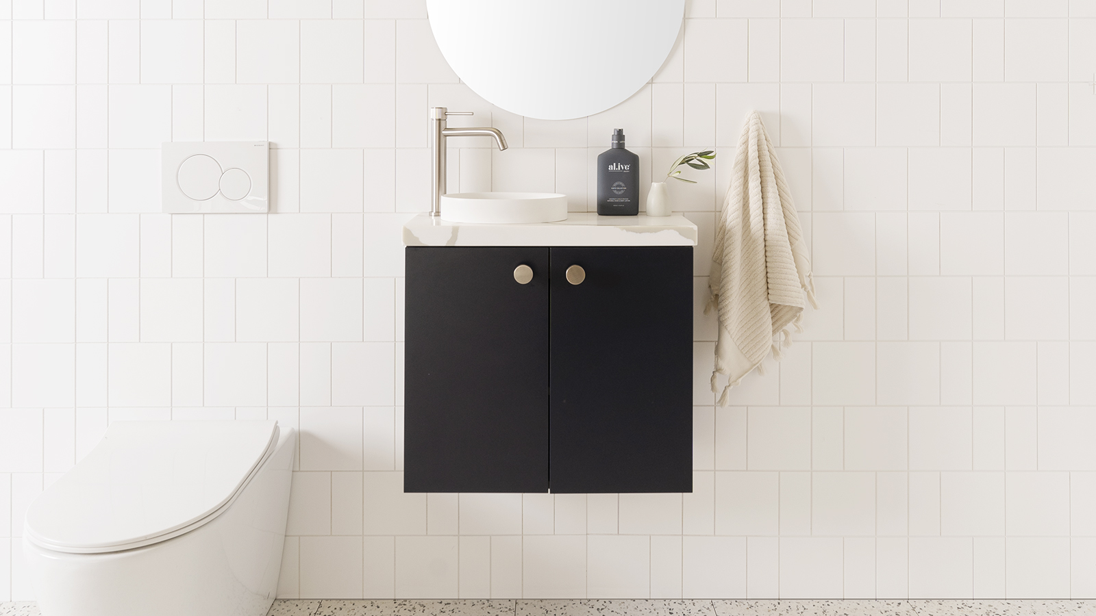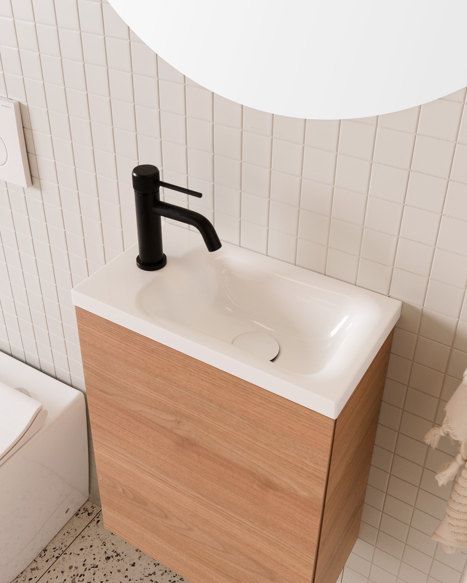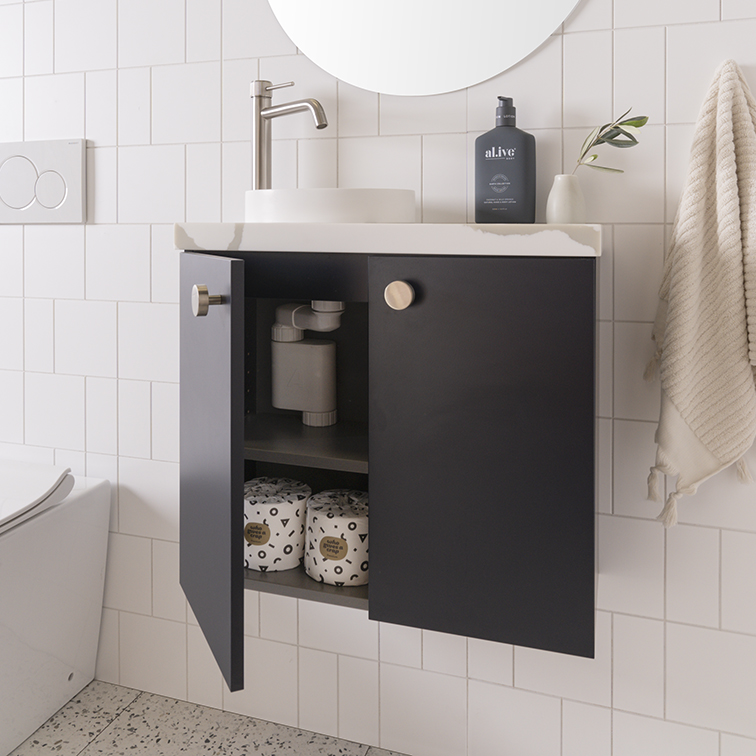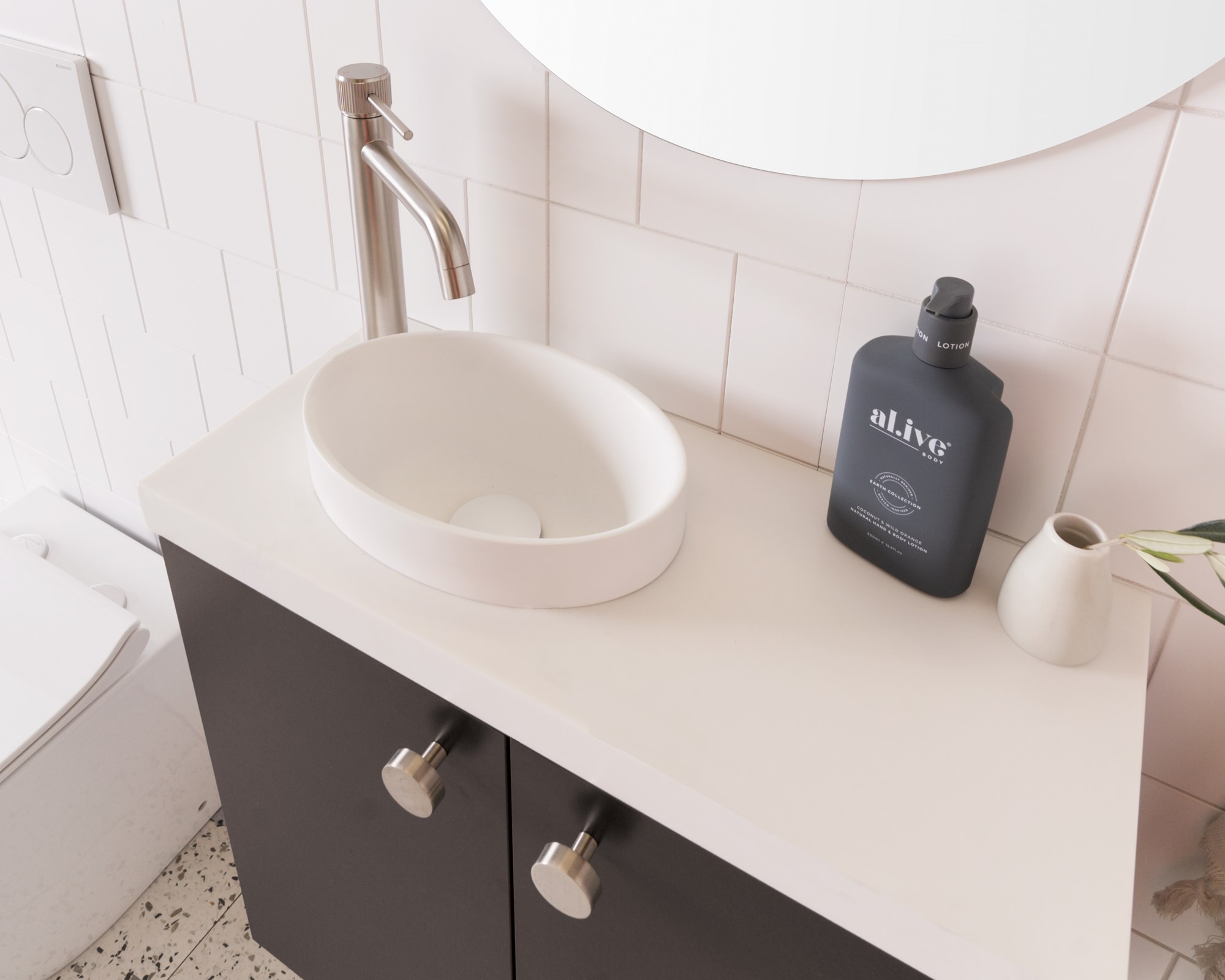 400mm available in Ceramic or Cast Marble moulded tops (1 tap hole only). 400, 600 and 900mm available with benchtop options* for all sizes (no extra charge for basin and tap hole cut-out).