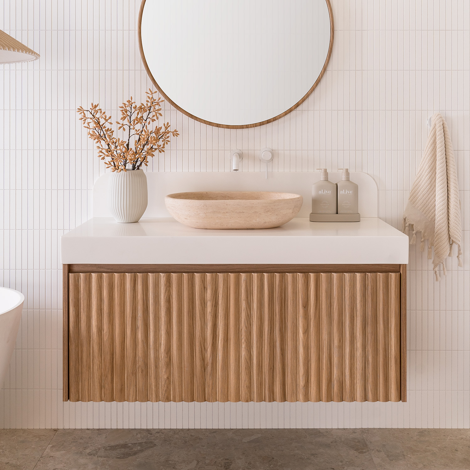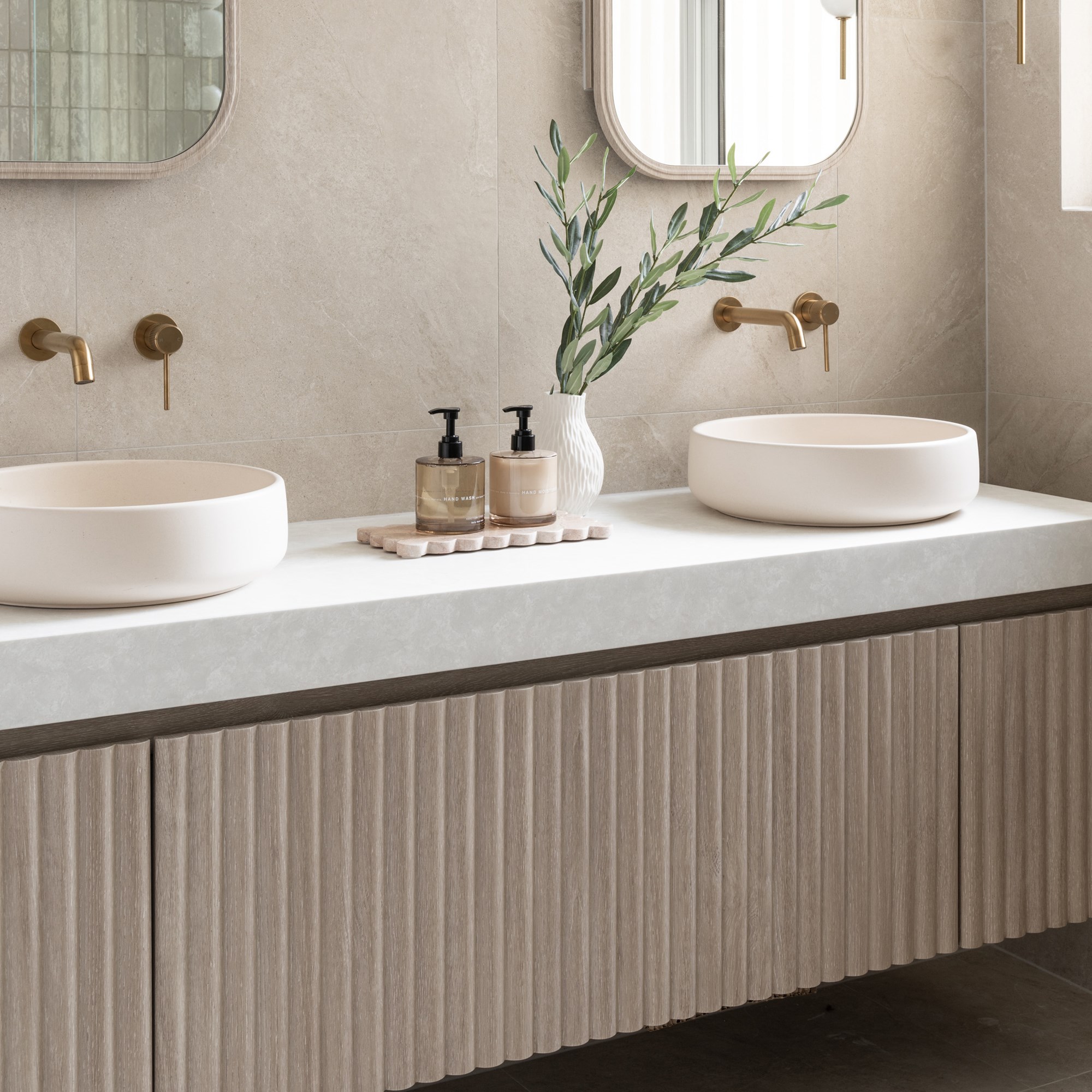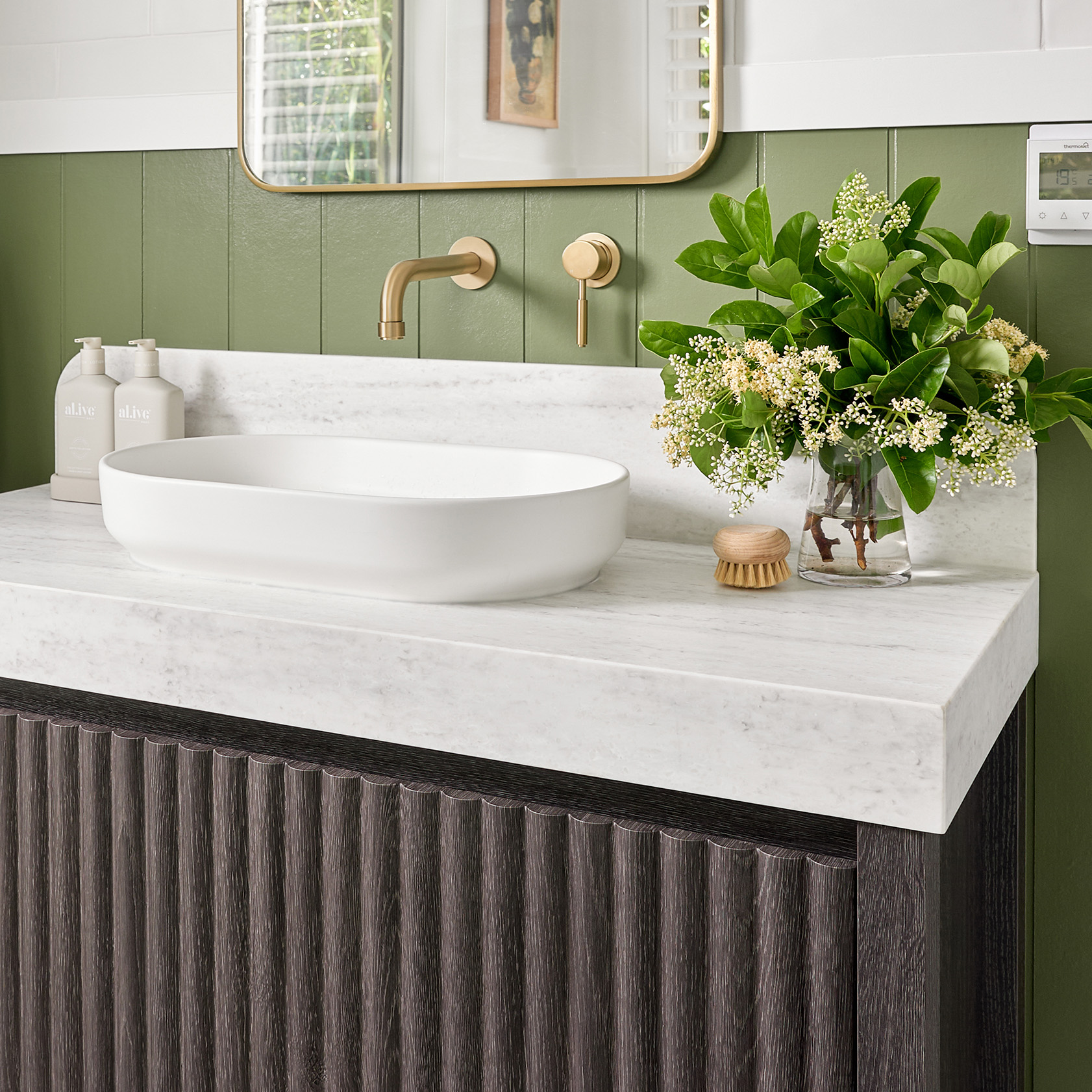Complimentary 180mm splashback with 80mm radius, in matching benchtop colour.
