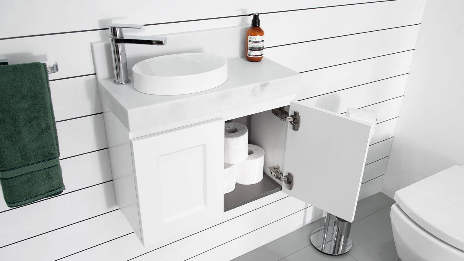 Premium graphite interior, 900mm includes adjustable internal shelf (opposite basin).