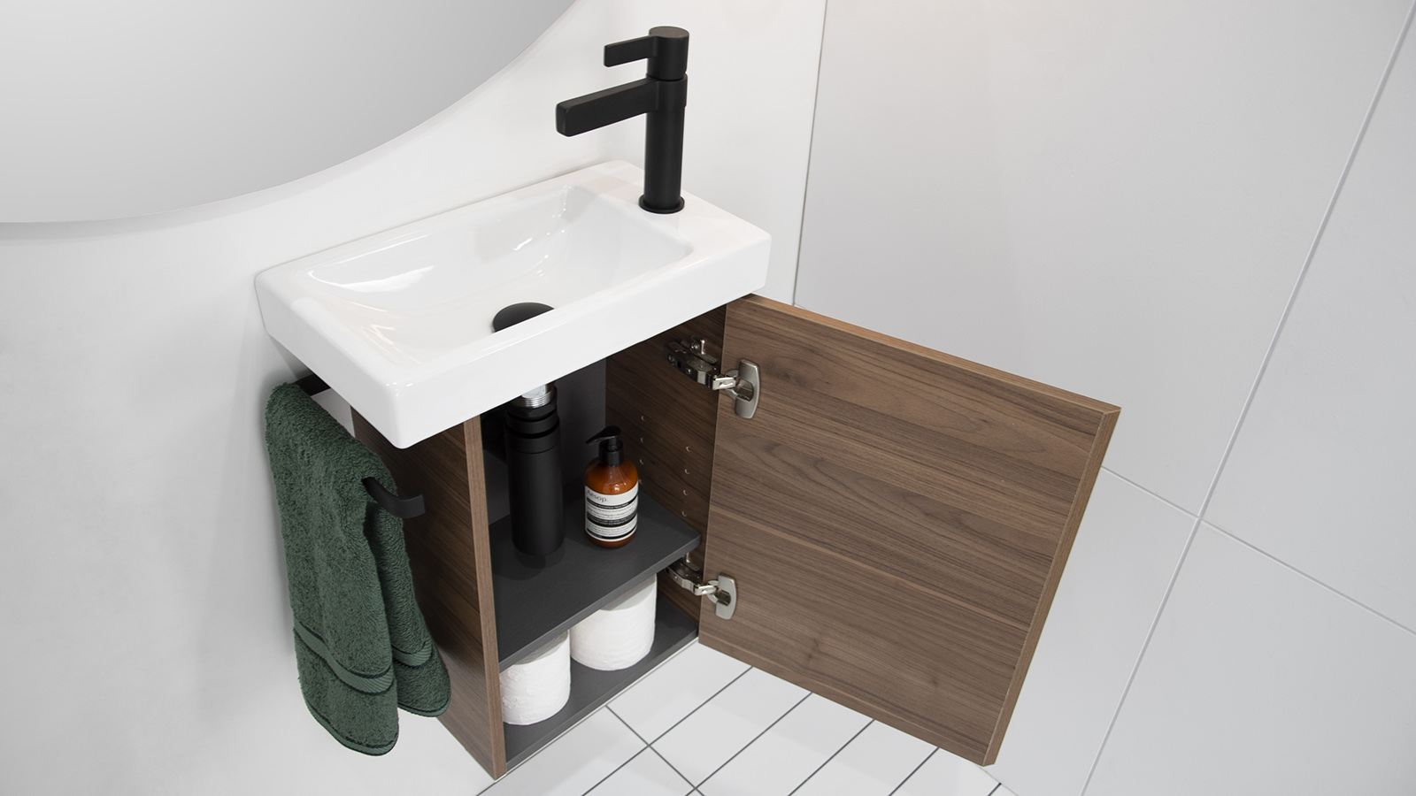 Finger-pull door with soft-close, left or right-hand hinged (tap hole on opposite side to towel ring).
