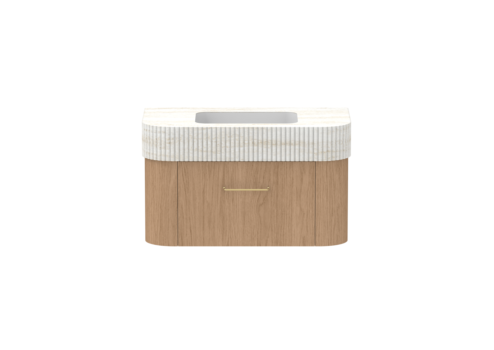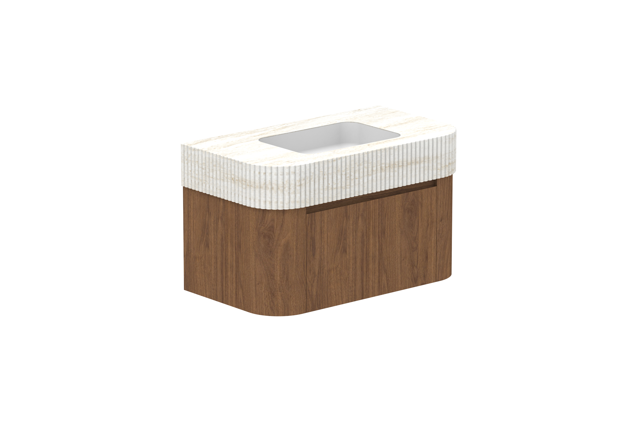 Imperial: Moulded top with fluted edge detailing, fabricated from Durasein Solid Surface. Integrated matte white basin with overflow. 0 tap hole only, can be drilled onsite. Available in Blossoming & Sakal Durasein only.