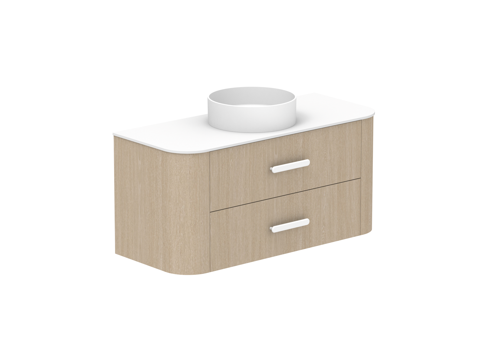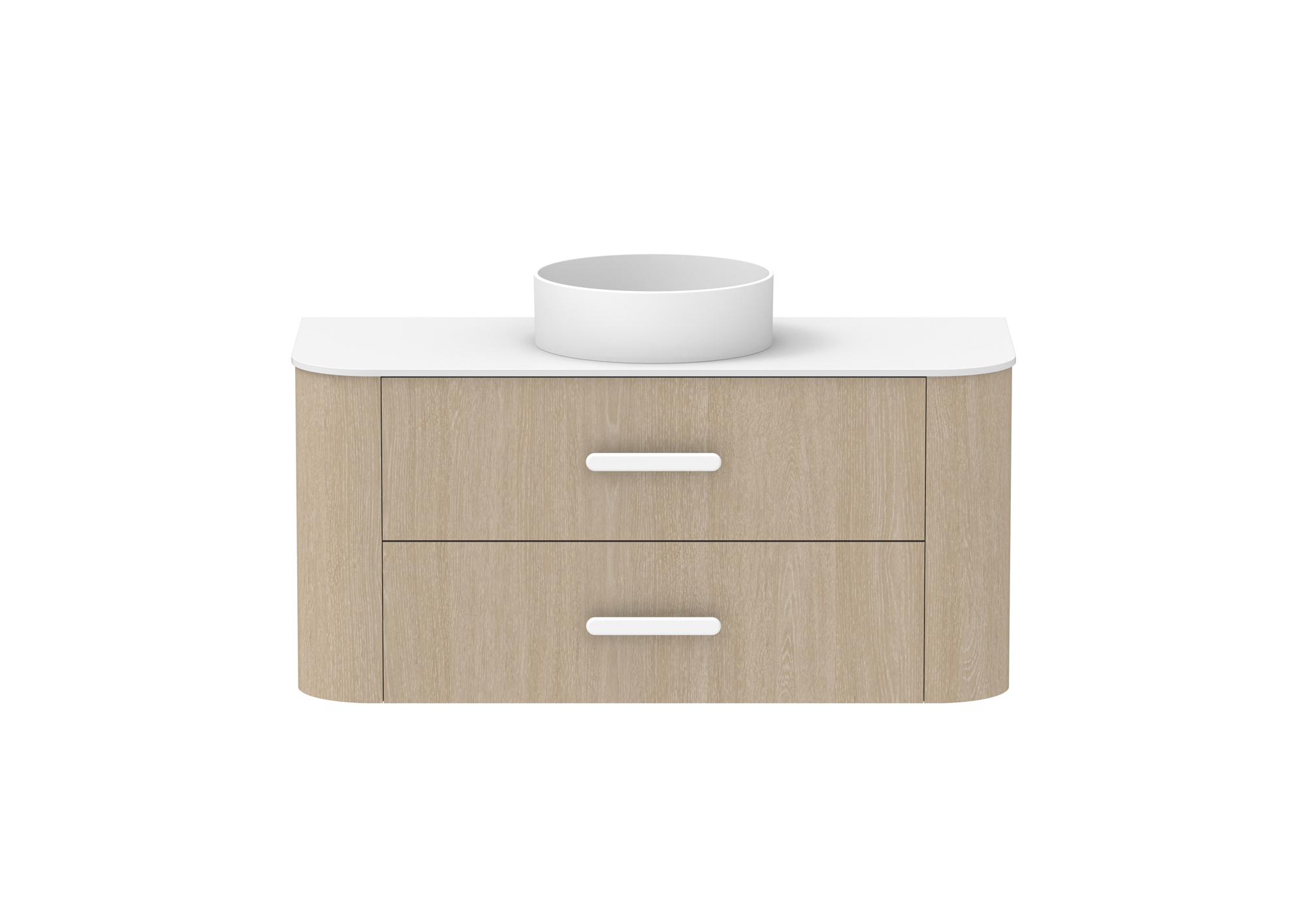 Matte Ceramic: Curved ceramic moulded top in matte finish, featuring an integrated overflow positioned in the front of the bowl. Tap hole available as 10 or 2 o’clock position or 0 tap hole (for wall taps).