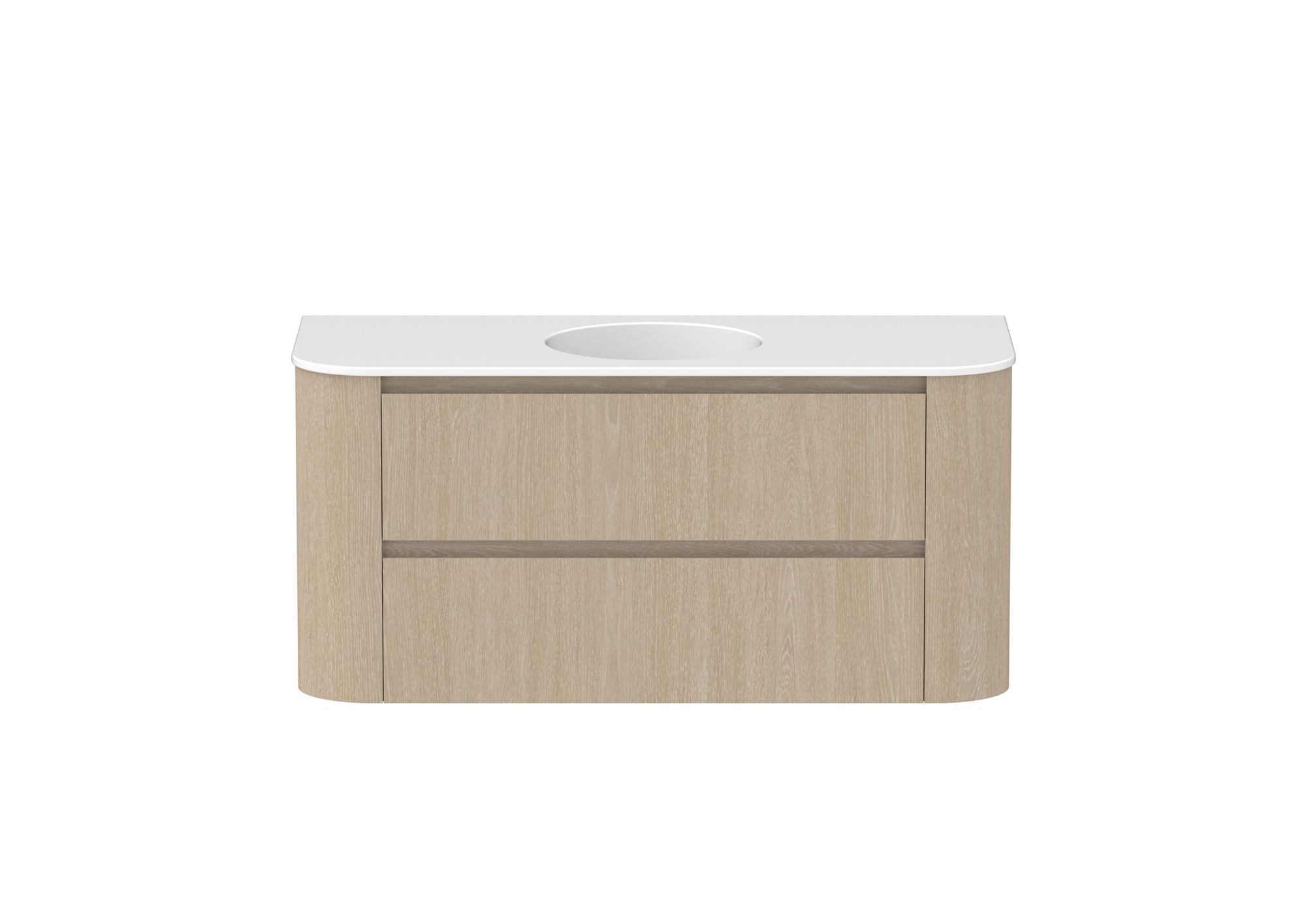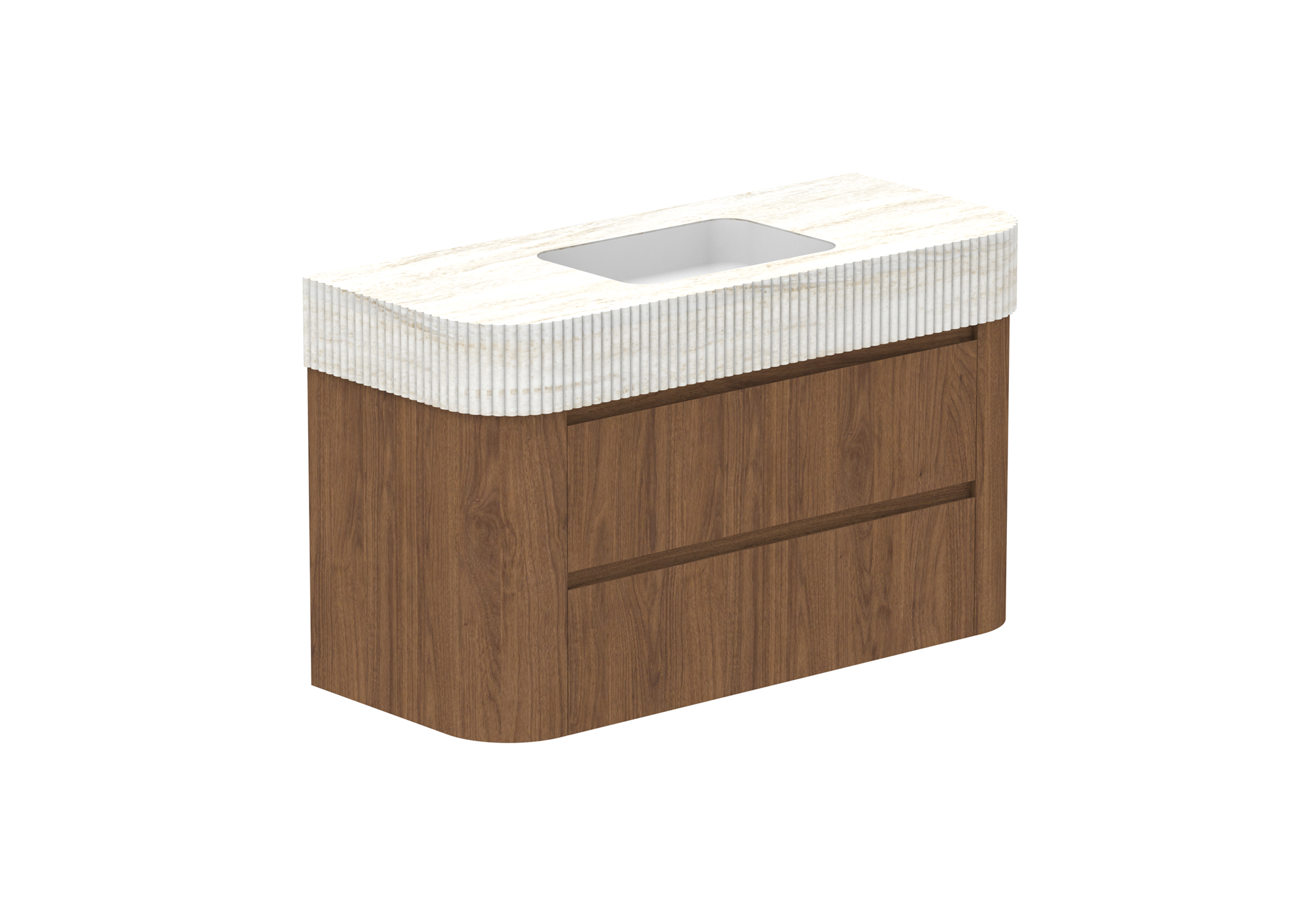 Imperial: Moulded top with fluted edge detailing, fabricated from Durasein Solid Surface. Integrated matte white basin with overflow. 0 tap hole only, can be drilled onsite. Available in Blossoming & Sakal Durasein only.