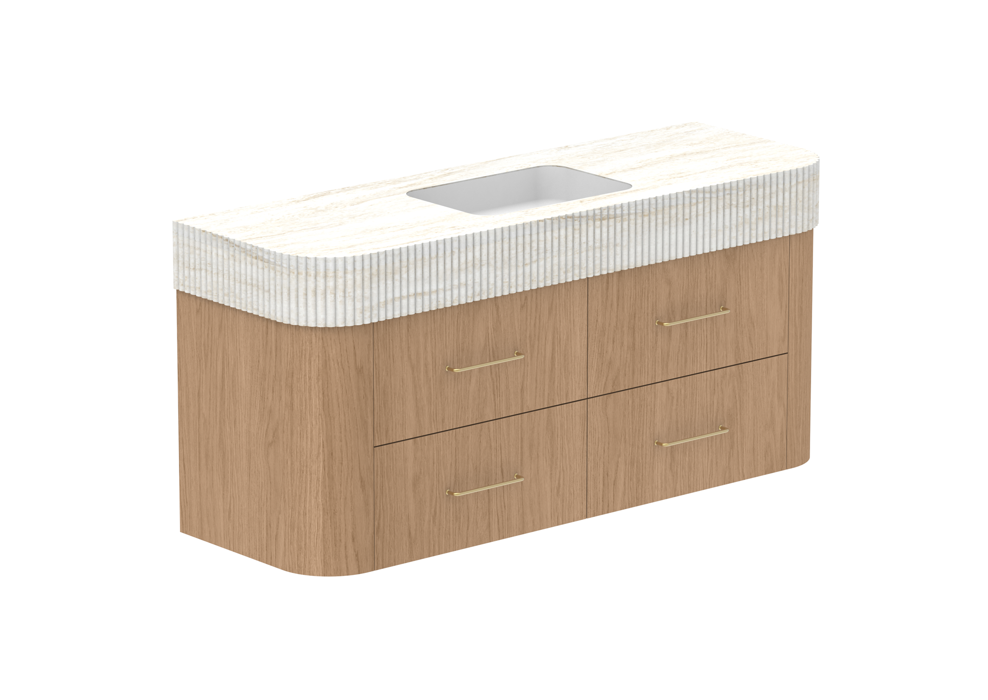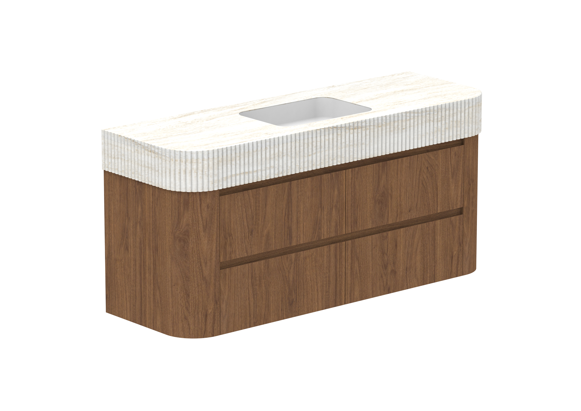 Imperial: Moulded top with fluted edge detailing, fabricated from Durasein Solid Surface. Integrated matte white basin with overflow. 0 tap hole only, can be drilled onsite. Available in Blossoming & Sakal Durasein only.