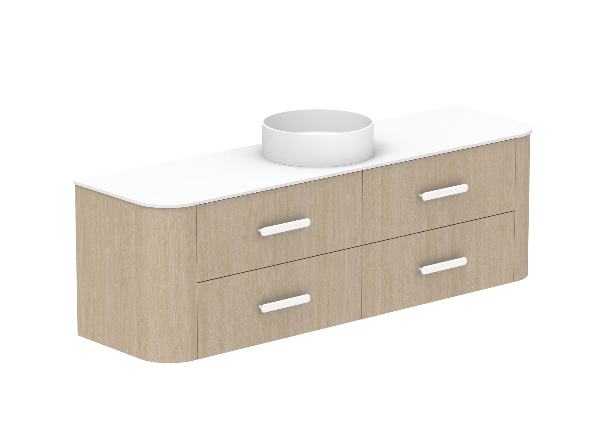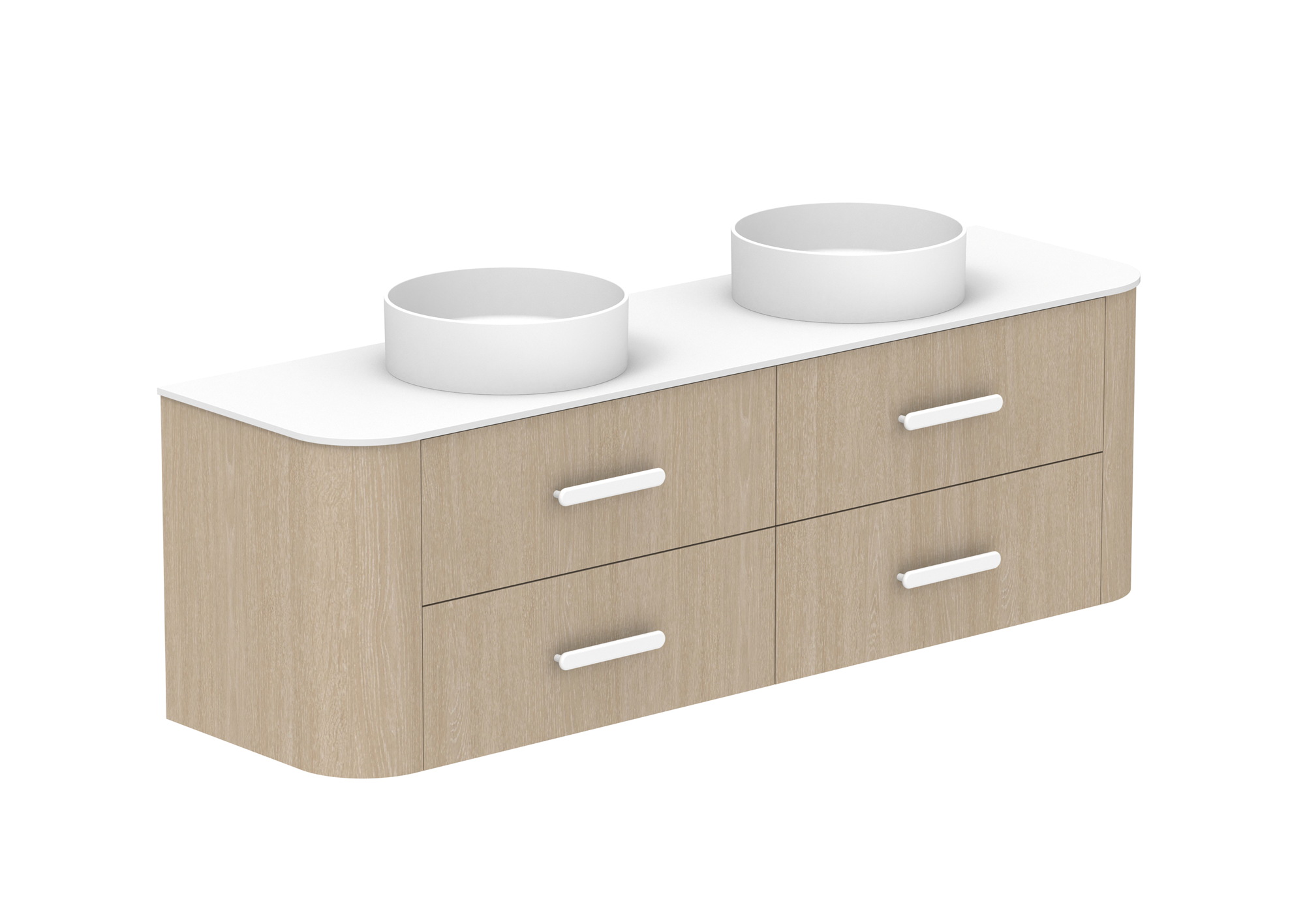 Matte Ceramic: Curved ceramic moulded top in matte finish, featuring an integrated overflow positioned in the front of the bowl. Tap hole available as 10 or 2 o’clock position or 0 tap hole (for wall taps).