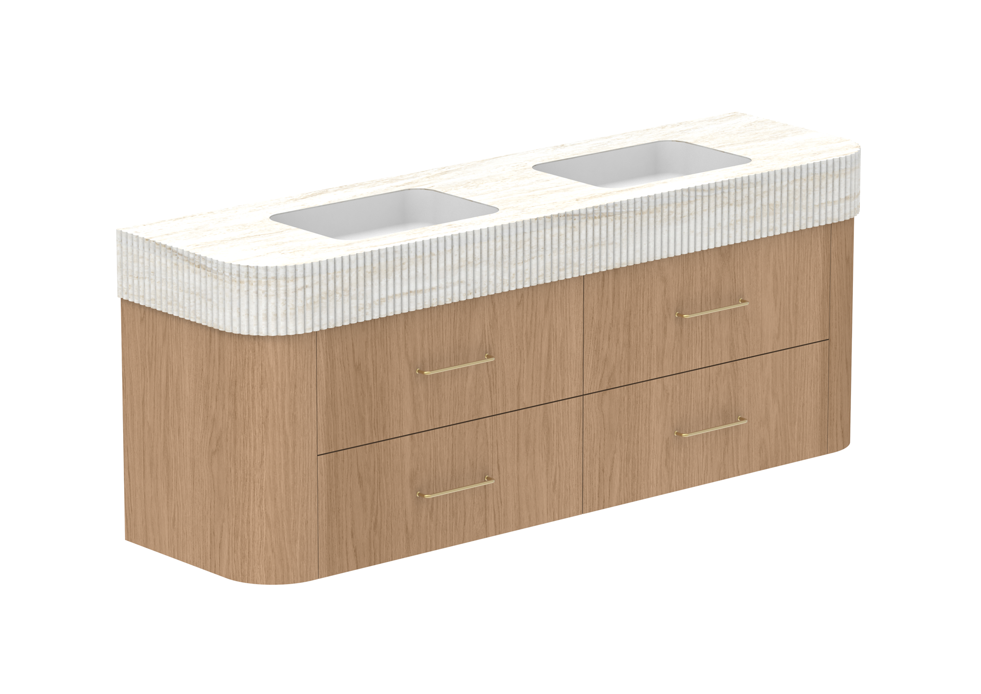 Imperial: Moulded top with fluted edge detailing, fabricated from Durasein Solid Surface. Integrated matte white basin with overflow. 0 tap hole only, can be drilled onsite. Available in Blossoming & Sakal Durasein only.
